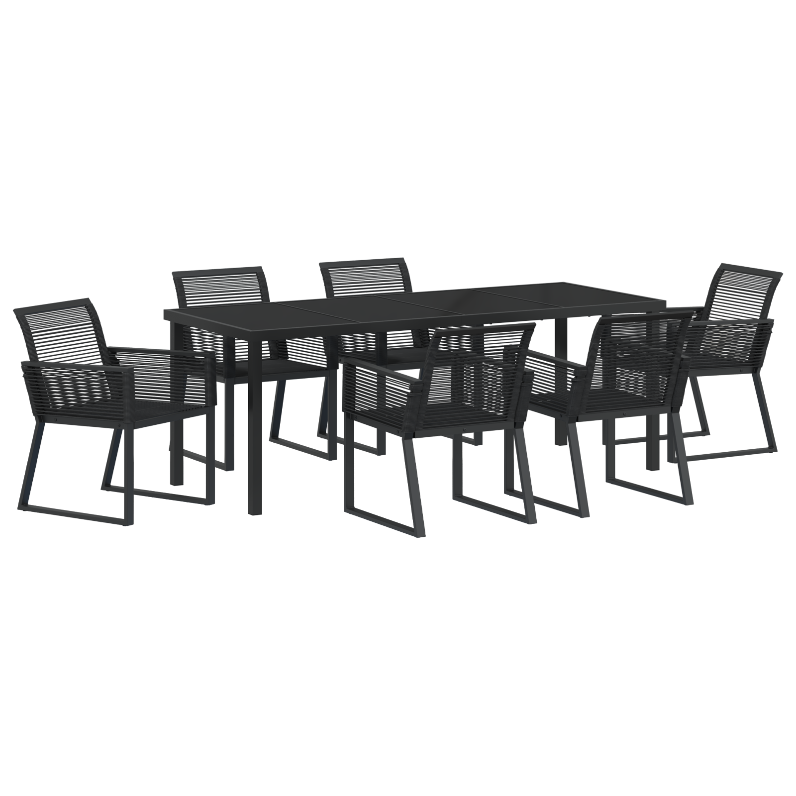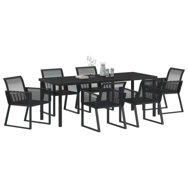 Uživaj v najboljšem zunanjem jedilnem doživetju z vidaXL 7-delno vrtno jedilno garnituro, narejeno iz elegantnega črnega poli ratana. Izgleda super v vsakem na terasi ali vrtu, vabi prijatelje in družino, da delijo obroke in dobre čase.