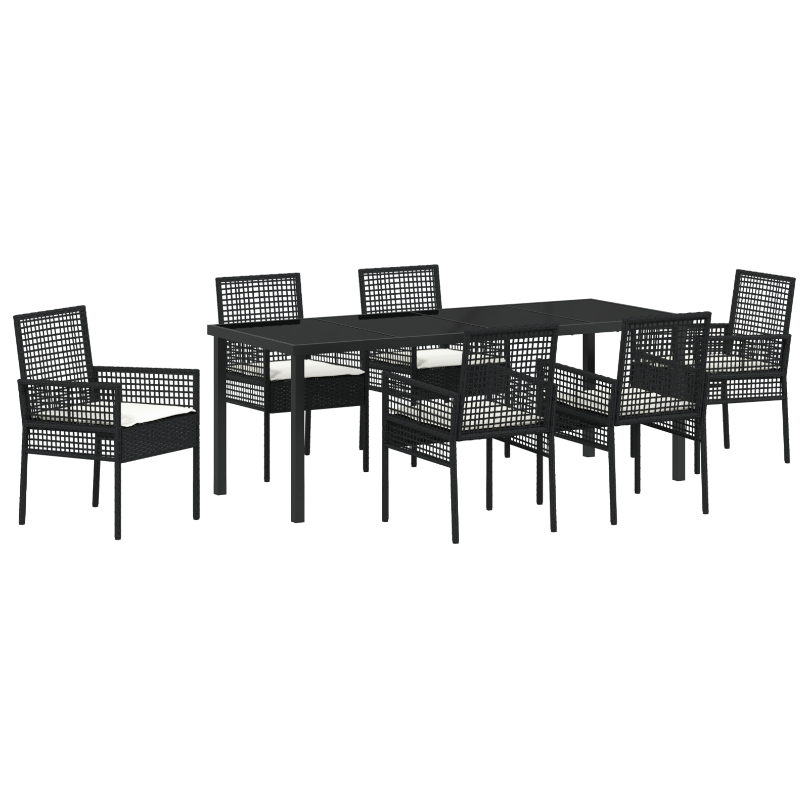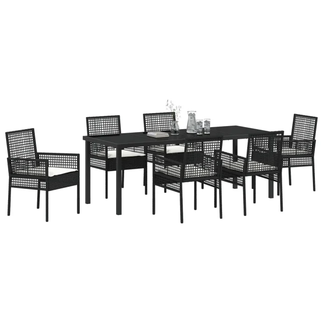Ta 7-delna vrtna jedilna garnitura je idealna mešanica modernosti in praktičnosti, kar jo dela najboljši izbor za vaš zunanji jedilni prostor. Ima šest elegantnih stolov in veliko pravokotno mizo, vse v drzno črni barvi, ki prinaša pridih elegance terasam ali vrtom.