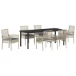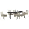 Ta vrtna jedilna garnitura prinaša svež občutek udobja in sloga ter je den najboljša izbira za vaše zunanje obroke. Set vključuje eno pravokotno mizo in šest lepo oblikovanih stolov, ki odlično združujejo svetlo sivo in temno sivo barvo, da obogatijo izgled vaše terase, decka ali balkona.