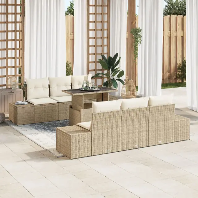 Ta set vrtnih kavčev popolnoma združuje udobje in moderni stil, kar ga naredi za super dodatek zunanjim prostorom, kot so terase, vrtovi ali balkoni. Modularna zasnova omogoča enostavno prilagajanje 7-delnega seta, kar daje dovolj sedežev za druženje s prijatelji in družino ter obogati vaš zunanji prostor.