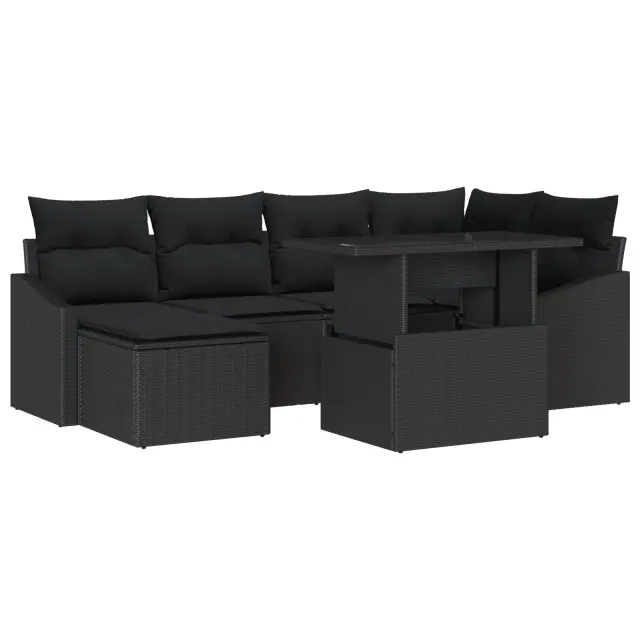 Ta vrtna sedežna garnitura s sedmimi deli preoblikuje sproščanje in stil. S svojim modernim videzom in elegantnim črnim poli ratan zaključkom, brez težav obogati vsak patio ali balkon ter ponuja udobno sedenje za druženja ali mirne večere pod zvezdami.