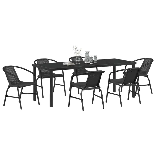 Ta set vključuje dva črna stola iz trpežnega plastičnega ratana in jekla, idealna za zunanjo uporabo. Popolna za obedovanje in sproščanje.Podatki o proizvajalcu vključujejo informacije (naziv, naslov, državo in elektronski naslov) povezane s proizvajalcem izdelka.