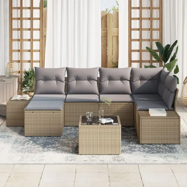 Ta 7-delni modularni zunanji sofa set združuje stil in funkcionalnost. Popoln je za osvežitev tvojega vrta ali patia. S trendovskim dizajnom in prostorom za do šest ljudi je idealen za zabavne druženja ali preprosto uživanje na svežem zraku.