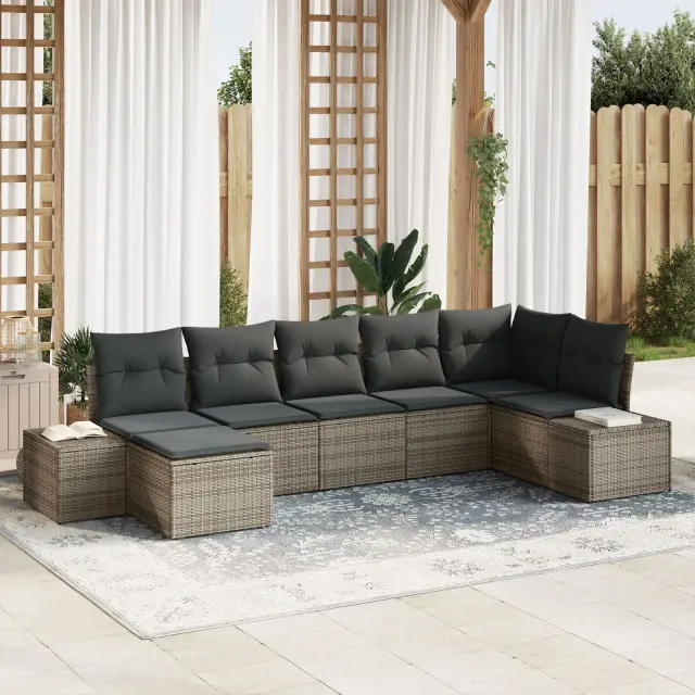 Očarajte svoj zunanji prostor s tem kul 7-delnim vrtni kavč setom, ki prinaša moden stil in praktičnost. Z modrnimi sivimi in črnimi barvami je popoln za sproščanje na vašem balkonu ali patio med lepimi poletnimi načrti, saj nudi prijetna mesta za sprostitev ali zabavo.