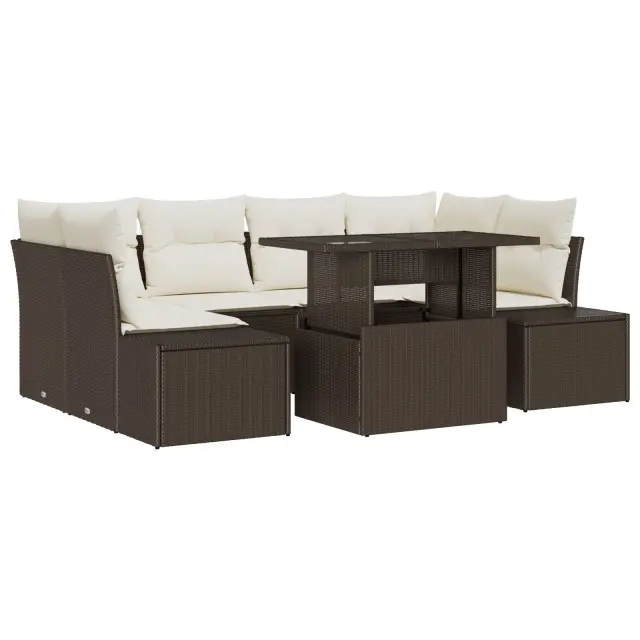 Ta nabor vrtnjih kavčev s 7 kosi vnese eleganco v tvojo zunanjo dekoracijo. Združuje stil in funkcionalnost, hkrati pa nudi veliko sedenja za sprostitev ali družinska srečanja. Narejen iz trdnega ratana z mehkim oblazinjenjem, je odlična izbira za terase, balkone ali prostore za zabave na prostem.