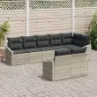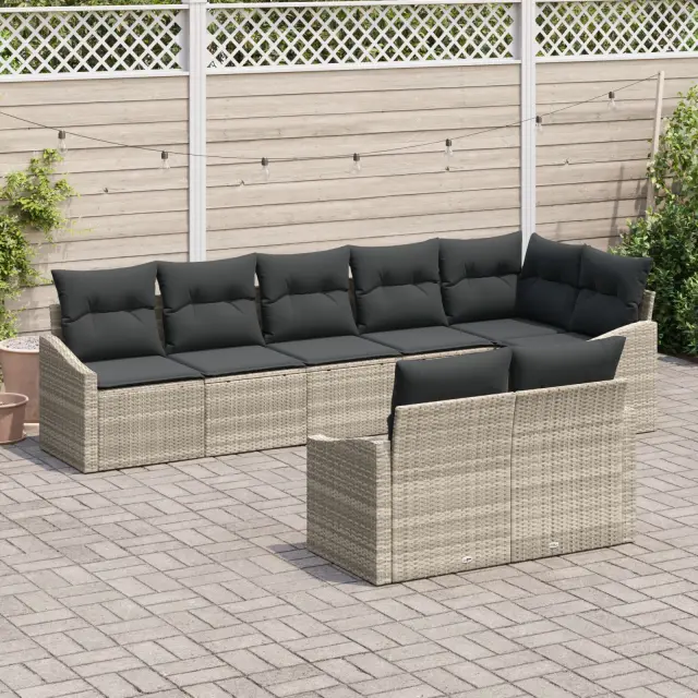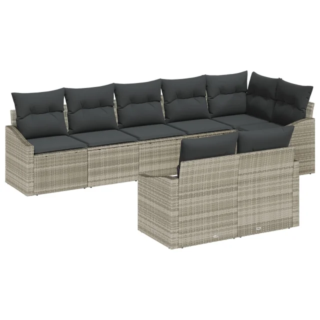Ta vrtna jedilna garnitura je idealno pohištvo za zunaj, super za balkone in vrtove. S svojim modernim svetlo sivim videzom iz poli ratana se udobno prilega osem osebam - idealno za druženja ali obroke na prostem.