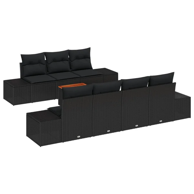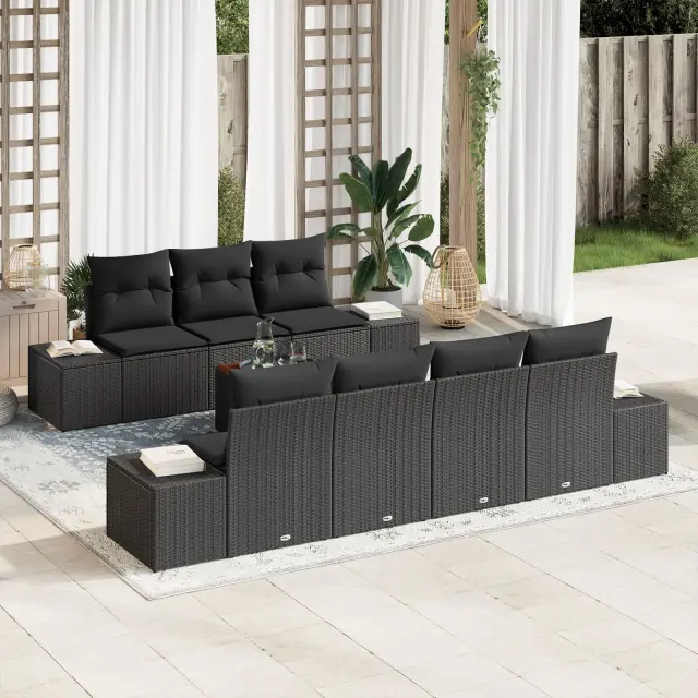 Ta stilska vrtna kavčna sestava je odličen dodatek za vsak zunanji prostor, ki kombinira udobje s sodobnim dizajnom. Njene sleek linije in črn videz osvetlijo terase, balkone ali vrtove, povabijo pa vas k sprostitvi na prostem s prijatelji in družino.