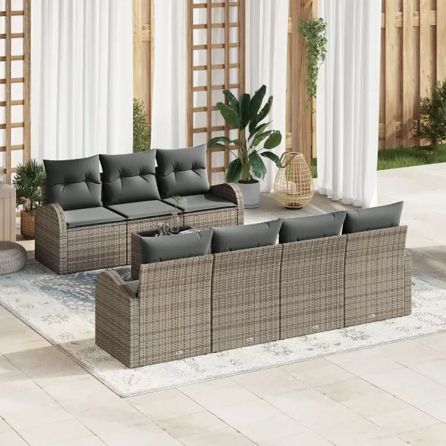 Ta set vrtne sedežne garniture prinaša stil in funkcionalnost vsakemu zunanjemu prostoru, saj združuje moderen dizajn in udobje. Ponuja veliko sedežev, kar je super za druženje ali sproščanje s prijatelji in družino.