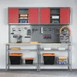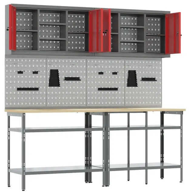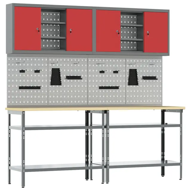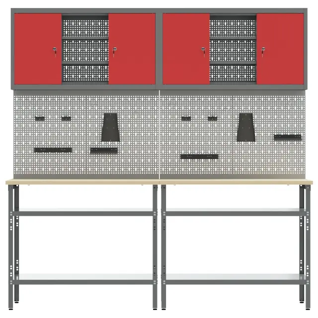 Ta industrijski set za shranjevanje orodij ti daje odlično priložnost za urejeno in učinkovito delovno površino. Je narejen iz trdnega jekla, kar mu daje tako estetski kot praktičen videz - idealen za vsako delavnico ali garažo. Eleganten sivi zaključek in rdeče ročice dajo delovni mizi trdno površino ter dodajo malo industrijskega pridiha. Pametna zasnova olajša dostop do tvojega orodja in ohranja vse v redu.