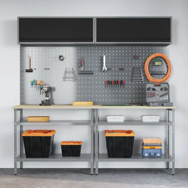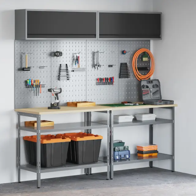 Komplet Industrijska organizacija orodij je top rešitev za tiste, ki hočejo izboljšati svoje delovno okolje. S črno in sivo zasnovo se prilagaja vsakemu prostoru, kjer imate orodja, in ohranja vse zadostno urejeno.