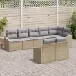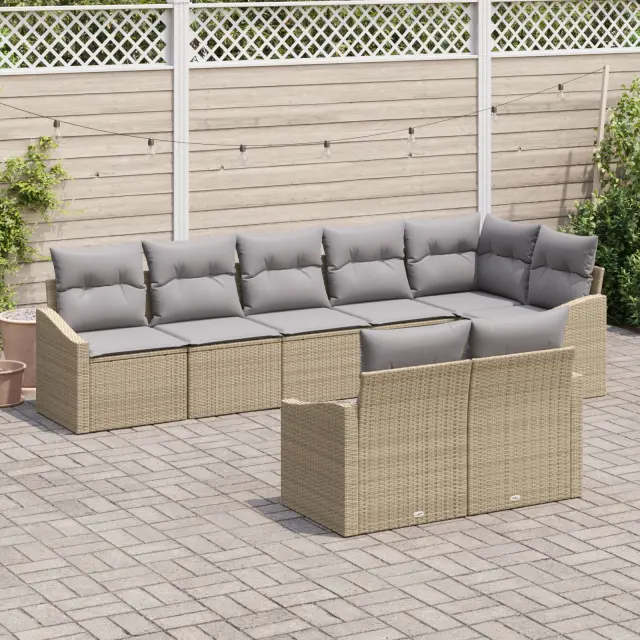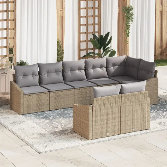 Ta vrtni jedilni set je modern in praktičen, idealen za terase in balkone. Njegova moderna bež poli ratan zasnova sprejme do osem oseb, kar je odlično za družinske obroke ali srečanja s prijatelji na prostem.