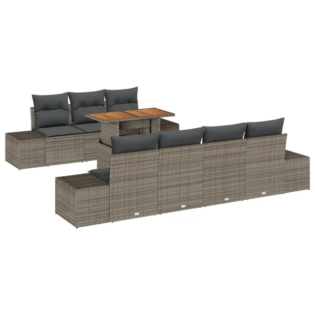 Ta 8-delna vrtna jedilna garnitura je super kombinacija stila in funkcionalnosti, nujna za zunanje prostore, kot so terase ali vrtovi. Ima sodoben dizajn z trdnim poly ratan okvirjem in udobnimi blazinami, kar ustvari prijetno vzdušje za družinska srečanja ali preprosto lenarjenje na soncu.