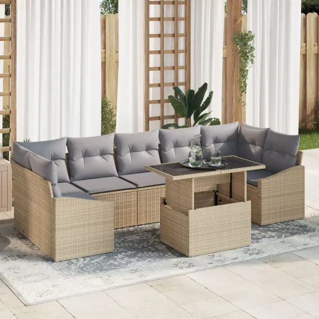 Ta 8-delna zunanja sedežna garnitura je narejena iz visokokakovostnega sintetičnega ratana in oblečena v udobne blazine. Je elegantna izbira za vaša srečanja na balkonu ali vrtu. Chic bež in siva barva se lepo prilega vsakemu prostoru.