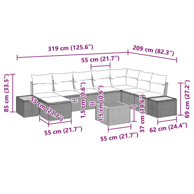 Ta zunanja sekcijska sedežna garnitura je narejena iz sintetičnega poli ratana v elegantni črni barvi, ki se lepo ujema z vsakim vrtom ali balkonom. Združuje udobje in praktičnost ter nudi odlično mesto za druženje ali sproščanje, obenem pa ponuja dovolj prostora za pogovor in druženje.