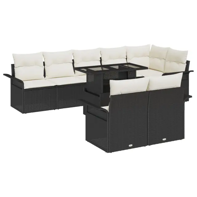 Ta 9-delna vrtna sedežna garnitura združuje sodoben dizajn z udobnim vzdušjem, kar je popolno za užitek na prostem. Narejena je iz trpežnega poli ratana, set pa vključuje mehke blazine v stilsko kremni barvi, kar tvoj patio ali balkon naredi prijeten ter omogoča udobno uživanje s prijatelji in družino.