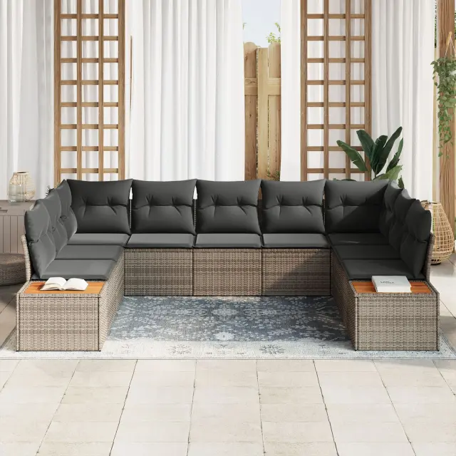 Ta zunanji sekcijski kavč daje vaši terasi in zunanjim površinam moderen in stiliziran pridih, resnično izboljšuje vašo zunanjo atmosfero. Sijajen sivi ratan pletenice in usklajene blazine nudijo prijeten kontrast, ki dvigne vaš zunanji dekor, ustvarjajo udoben, a eleganten prostor za druženje, sproščanje ali socializiranje.