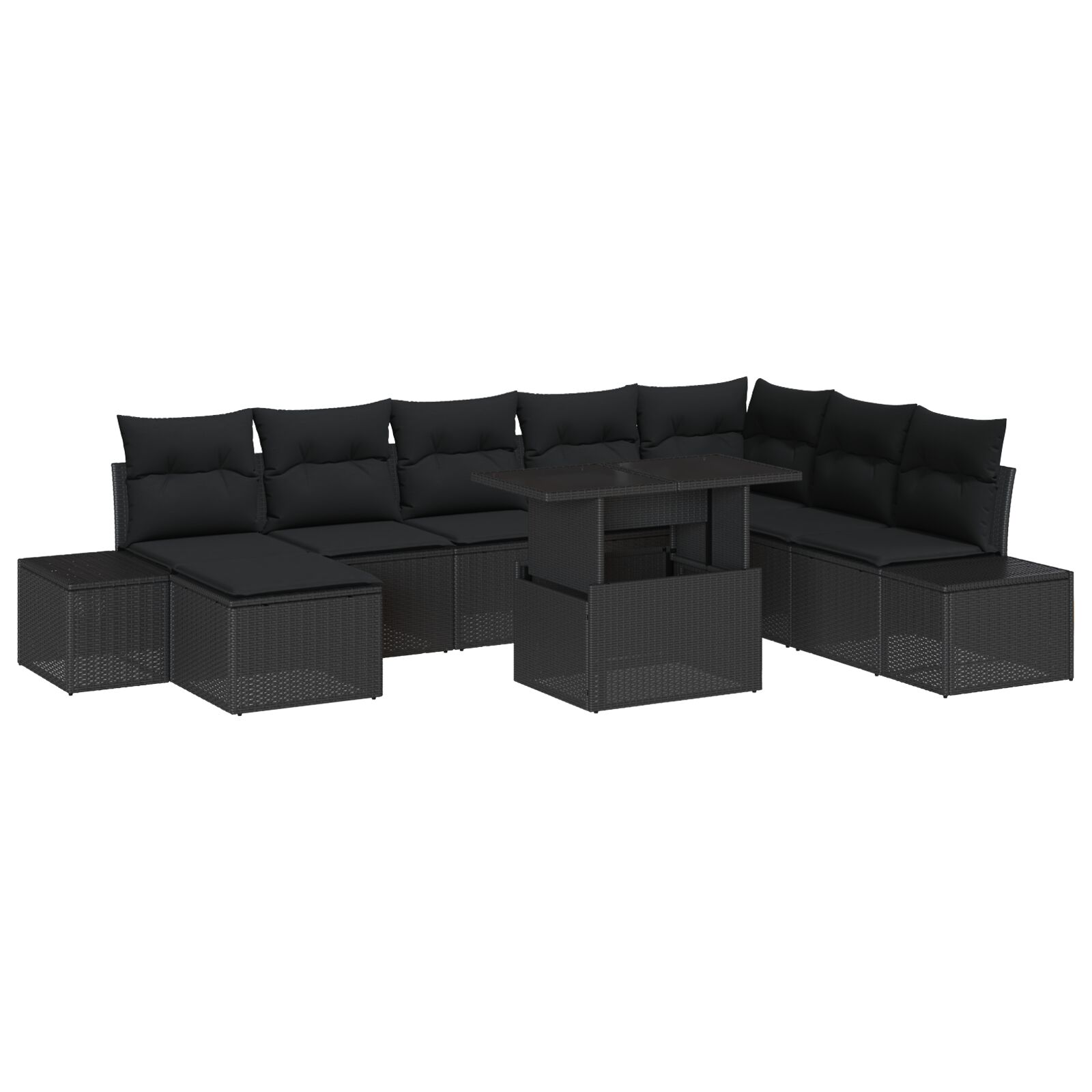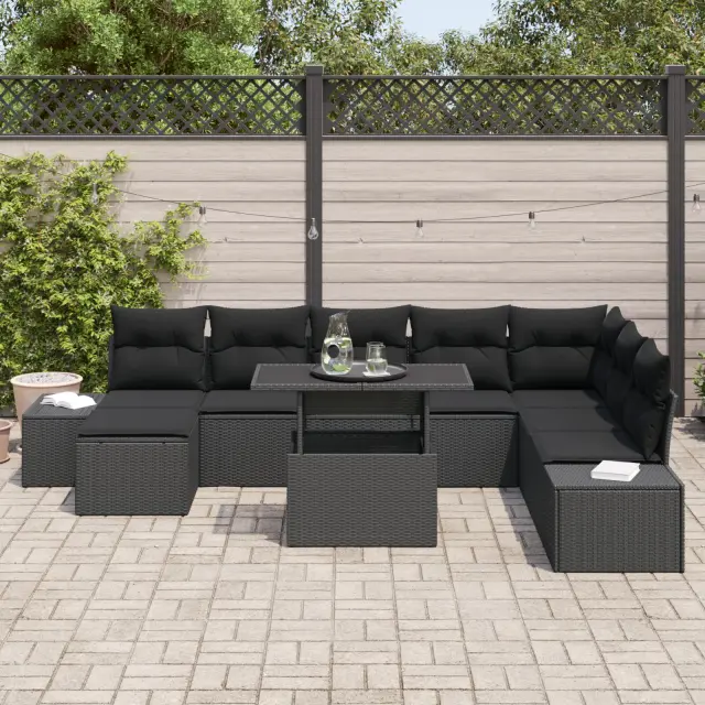 Ta set modernih vrtnih kavčev s 9 kosi je vse o redefiniranju zunanjega sedenja s svojim stylskim in praktičnim videzom. Črni poli ratan in mehke blazine ustvarjajo prijetno vzdušje, super za sproščanje in smejanje s prijatelji ali družino na vrtu ali terasi, ter dviga vašo zunanjo izkušnjo udobja in stila.