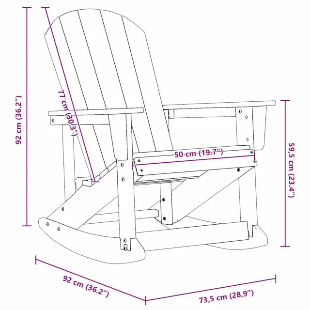 • Funkcionalna zasnova Vsaka podrobnost Adirondack Rocking Chair je zasnovana s tvojim udobjem v mislih. Široki nasloni za roke nudijo odlično podporo, nagnjen hrbet pa pripomore k sproščenemu vzdušju, idealnemu za lenarjenje.