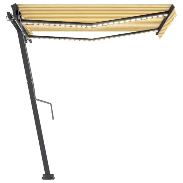 S tem zložljivim nadstreškom lahko ustvarite prijeten in kul zunanji prostor! Ta zunanja markiza je izdelana iz nerjavečega aluminijastega okvirja s prašnim premazom, zato je lahka in trdna. Blago prostostoječe tende je izdelano iz poliestra visoke gostote s PU oblogo, zato je odporno na vodo in UV. Naklon in višino lahko nastavite po želji. Močan steber se vrti za 360 stopinj, zato lahko markizo nastavite po želji. Avtomatsko zložljivo tendo lahko brez težav odprete in zaprete s pomočjo priloženega daljinskega upravljalnika. Markiza je opremljena s senzorjem za veter, ki poskrbi za samodejno zapiranje ob vetrovnih dneh. LED svetilke zagotavljajo energijsko varčno osvetlitev ponoči.Barva blaga: Rumena in belaBarva okvirja: AntracitnaMaterial: Aluminij s prašnim premazom, 100 % poliestrsko blago s PU oblogoCelotna velikost: 350 x 250 cm (Š x V)Velikost stebra: 300 x 245 cm (Š x V)Napetost: 230V~ , 0,68A; 50/60HzMoč: 155 WNavor: 20 NmHitrost: rpm 13LED napetost: 12 VPotrebno sestavljanje: Da 3069733