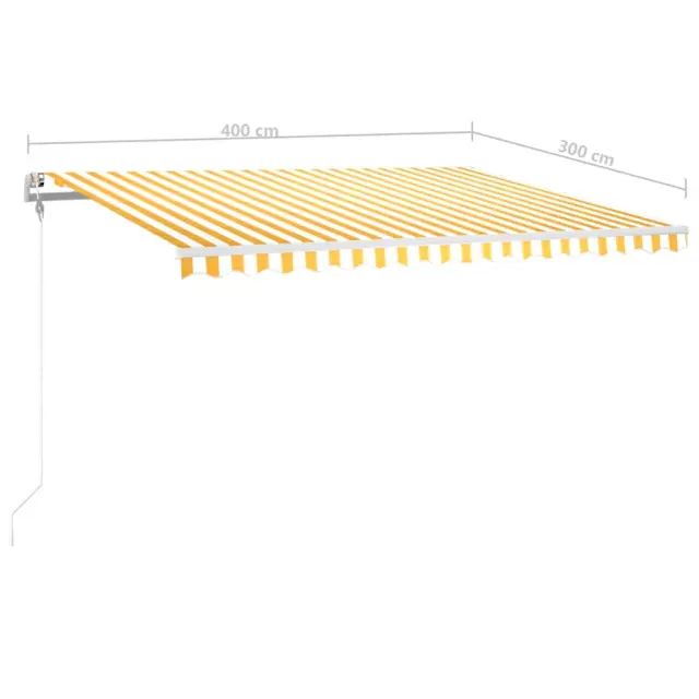 S tem zložljivim nadstreškom lahko ustvarite prijeten in kul zunanji prostor! Ta zunanja markiza je izdelana iz nerjavečega aluminijastega okvirja s prašnim premazom, zato je lahka in trdna. Blago tende je izdelano iz poliestra visoke gostote s PU oblogo, zato je odporno na vodo in UV. Naklon in višino lahko nastavite po želji. Avtomatsko zložljivo tendo lahko brez težav odprete in zaprete s pomočjo priloženega daljinskega upravljalnika. Markiza je opremljena s senzorjem za veter, ki poskrbi za samodejno zapiranje ob vetrovnih dneh. LED svetilke zagotavljajo energijsko varčno osvetlitev ponoči.Barva: Rumena in belaBarva okvirja: BelaMaterial: Aluminij s prašnim premazom, 100 % poliestrsko blago s PU oblogoVelikost: 400 x 300 (Š x V)Napetost: 230V~ , 0,68A; 50/60HzMoč: 155 WNavor: 20 NmHitrost: rpm 13LED napetost: 12 VPotrebno sestavljanje: Da 3068913
