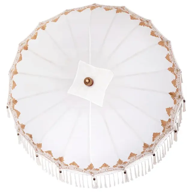 Ta balijski sončnik vnese lepo balijsko estetiko v vaš zunanji prostor. Z veliko senca njegov vrhunski trden leseni drob, bombažna zasnova in bambusova rebra ustvarjajo prijetno vzdušje, pravo za mirne trenutke v vrtu. Ne glede na to, ali je postavljen v dvorišču ali na terasi, naravne barve in nežne obrobe bogatijo prostor s tropsko eleganco, povabijo pa k sprostitvi in udobju med poletjem.