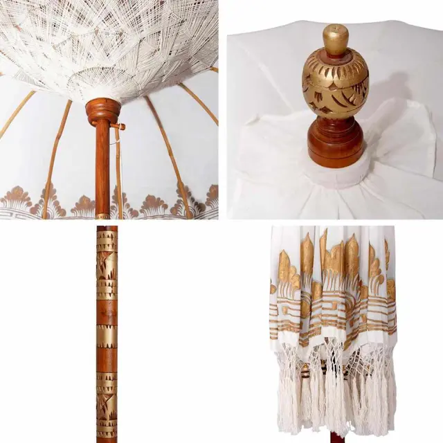 • Bambusova rebra: Zasnova senčila je podprta z močnimi bambusovimi rebri, znanimi po svoji moči in prilagodljivosti. Ta naravni material ne le povečuje vzdržljivost sončnika, ampak se tudi harmonično ujema z balijskim stilom, ustvarjajoč neustavljivo tropsko privlačnost.