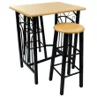 Stilski in sodobni barski komplet vključuje 1 barsko mizo in 2 stolčka in bo dodal pridih elegance v vašo kuhinjo ali jedilnico. Sama kompaktnost kompleta je idealna za manjše sobe ali za vse, ki želijo prihraniti prostor.  Miza in vrhi stolčkov so narejeni iz vzdržljivega lesa, ki je enostaven za čiščenje. Jeklen okvir nudi odlično stabilnost. Barski stolčki se lahko shranijo pod mizo za prihranitev prostora, ko niso v uporabi. Paket vsebuje 1 mizo in 2 stolčka.Material: Les in jekloBarva: Črna in bežDimenzije mize: 72,5 x 55 x 82,5 cm (D x Š x V)Dimenzije stolčka: 30 x 30 x 70 cm (Š x G x V)Paket vsebuje 1 mizo in 2 stolčka 275403
