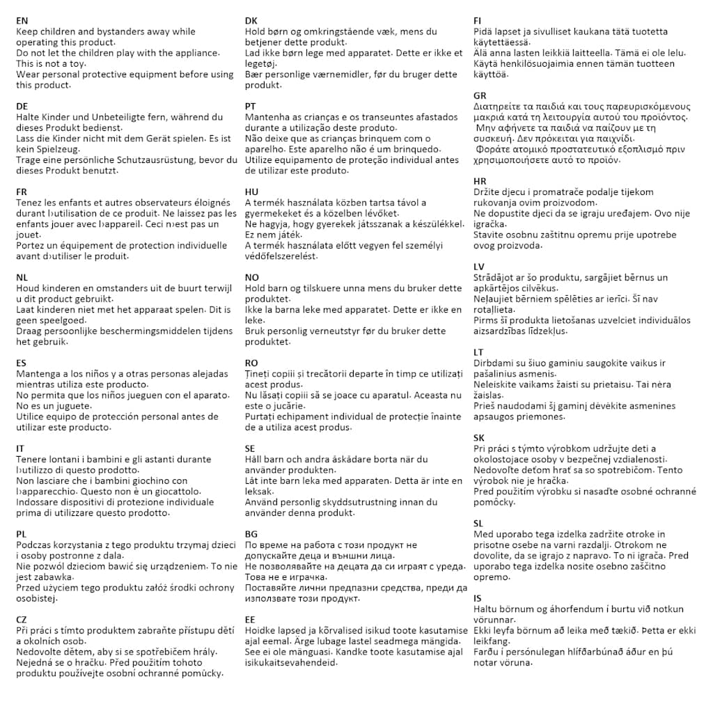 Otroci in navzoče osebe naj med uporabo naprave ostanejo na varni razdalji. Otrokom ne dovolite, da se igrajo z napravo. To ni igrača. Pred uporabo tega izdelka nosite osebno zaščitno opremo.