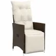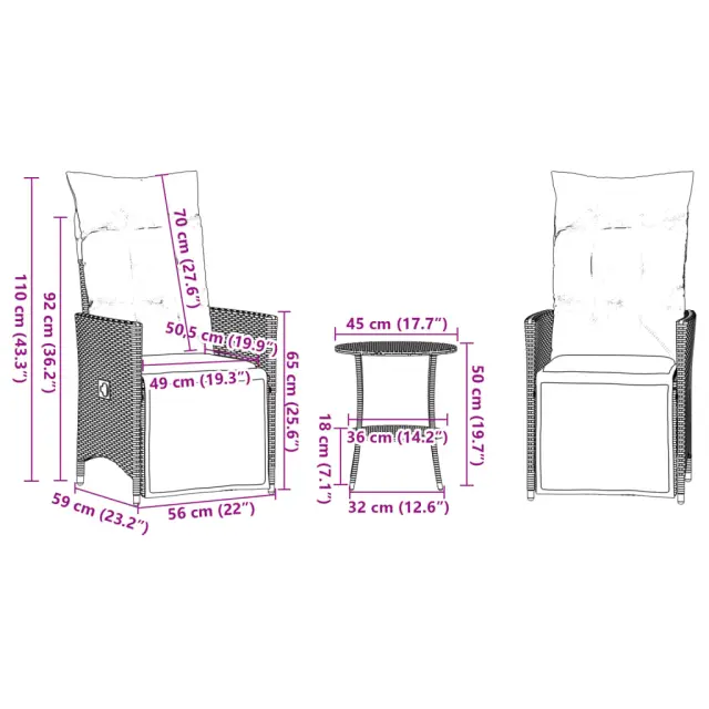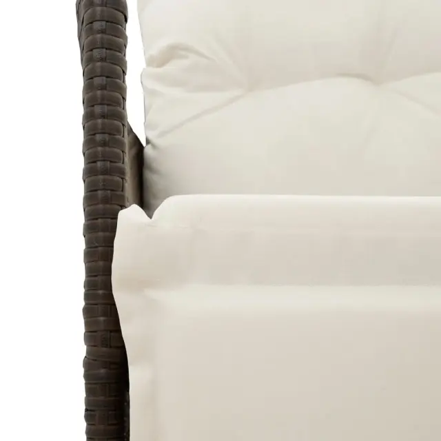 S to udobno bistro garnituro lahko z družino in prijatelji uživate v kavi ali klepetu na vrtu, dvorišču ali balkonu. Vzdržljiv material: PE ratan, znan tudi kot poli ratan, je močan sintetični material, ki zahteva malo vzdrževanja in je videti kot naravni ratan. Je lahek, enostaven za čiščenje in se zaradi svoje vzdržljivosti in odpornosti na vremenske vplive pogosto uporablja za zunanje pohištvo.Nastavljivo naslonjalo za hrbet in noge: Ta vrtni sedež ima ročaj. S potegom ročaja lahko naslonjalo za hrbet in noge nastavite v poljuben položaj. Z ročajem lahko naslonjalo za hrbet in noge hitro vrnete v prvotni položaj.Udobno sedenje: Ta zunanja garnitura z debelo podloženimi blazinami zagotavlja udobno sedenje.Prevleko je mogoče odstraniti in oprati: Te sedežne blazine imajo odstranljive prevleke za lažje pranje in vzdrževanje. Hrbtne blazine imajo na zadnji strani zavihek za enostavno pritrditev na naslonjala.Robusten in stabilen okvir: Prašno barvan jekleni okvir zagotavlja, da je vrtno pohištvo močno in stabilno za vsakodnevno uporabo na prostem. Dobro je vedeti:Če želite, da vaše zunanje pohištvo ostane lepo, vam priporočamo, da ga zaščitite z vodoodporno prevleko.UV-odpornoPotrebno sestavljanje: DaVrtni naslanjač:Barva: RjavaMaterial: PE ratan, jeklen okvir s prašnim premazomDimenzije v sedečem položaju: 56 x 59 x 92 cm (Š x G x V)Dimenzije v ležečem položaju: 56 x 83 x 85 cm (Š x G x V)Velikost sedišča: 49 x 50,5 cm (Š × G)Višina sedeža od tal: 44 cmVišina naslonjala za roke, merjena od tal: 63 cmMaksimalna nosilnost (na sedež): 110 kgMiza:Barva: RjavaMaterial: PE ratan, jeklen okvir s prašnim premazomDimenzije: 45 x 50 cm (Premer x V)Premer spodnje police: 36 cmBlazina:Barva: Kremno belaMaterial prevleke: Tkanina (100 % poliester)Polnilo sedežne blazine: PenaPolnilo hrbtne blazine: bombažna vlaknaDimenzije sedežne blazine: 48 x 90 x 3 cm (Š x G x D)Dimenzije hrbtne blazine: 70 x 48 x 10 cm (D x Š x D)Paket vsebuje:2 x Vrtni stol s funkcijo nagiba1 x Vrtna miza2 x Sedežna blazina s snemljivo pralno prevleko2 x Blazina za hrbet 365674