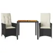 S to udobno bistro garnituro lahko z družino in prijatelji uživate v kavi ali klepetu na vrtu, dvorišču ali balkonu. Vzdržljiv material: PE ratan, znan tudi kot poli ratan, je močan sintetični material, ki zahteva malo vzdrževanja in je videti kot naravni ratan. Je lahek, enostaven za čiščenje in se zaradi svoje vzdržljivosti in odpornosti na vremenske vplive pogosto uporablja za zunanje pohištvo.Nastavljivo naslonjalo: Ta vrtni sedež ima ročaj. S potegom ročaja lahko naslonjalo nastavite v poljuben položaj in ga hitro vrnete v prvotni položaj.Stabilna mizna plošča, ki je enostavna za čiščenje: Ta vrtna miza ima ploščo iz akacijevega lesa, ki je čvrsta, vzdržljiva in jo je enostavno čistiti z vlažno krpo.Udobno sedenje: Ta zunanja garnitura z debelo podloženimi blazinami zagotavlja udobno sedenje.Prevleko je mogoče odstraniti in oprati: Te sedežne blazine imajo odstranljive prevleke za lažje pranje in vzdrževanje. Dobro je vedeti:Če želite, da vaše zunanje pohištvo ostane lepo, vam priporočamo, da ga zaščitite z vodoodporno prevleko.UV-odpornoPotrebno sestavljanje: DaStol z naslonjalom:Barva: ČrnaMaterial: PE ratan, jeklen okvir s prašnim premazomDimenzije v sedečem položaju: 57 x 59 x 92 cm (Š x G x V)Dimenzije v ležečem položaju: 57 x 83 x 85 cm (Š x G x V)Velikost sedeža: 47 x 48 cm (Š x G)Višina sedeža od tal: 44 cmVišina naslonjala za roke, merjena od tal: 63 cmMaksimalna nosilnost (na sedež): 110 kgMiza:Barva: ČrnaMaterial: PE ratan, jeklo, trden akacijev les z oljnim premazomDimenzije: 90 x 90 x 75 cm (D x Š x V)Blazina:Barva: Kremno belaMaterial prevleke: Tkanina (100 % poliester)Polnilo sedežne blazine: PenaPolnilo hrbtne blazine: bombažna vlaknaDimenzije sedežne blazine: 54 x 49 x 3 cm (Š x G x D)Dimenzije hrbtne blazine: 70 x 48 x 10 cm (D x Š x D) Paket vsebuje:2 x Vrtni stol s funkcijo nagiba1 x Vrtna miza2 x Sedežna blazina s snemljivo pralno prevleko2 x Blazina za hrbet 3276679
