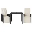 S to udobno bistro garnituro lahko z družino in prijatelji uživate v kavi ali klepetu na vrtu, dvorišču ali balkonu. Vzdržljiv material: PE ratan, znan tudi kot poli ratan, je močan sintetični material, ki zahteva malo vzdrževanja in je videti kot naravni ratan. Je lahek, enostaven za čiščenje in se zaradi svoje vzdržljivosti in odpornosti na vremenske vplive pogosto uporablja za zunanje pohištvo.Nastavljivo naslonjalo: Ta vrtni sedež ima ročaj. S potegom ročaja lahko naslonjalo nastavite v poljuben položaj in ga hitro vrnete v prvotni položaj.Steklena mizna plošča: Površina zunanje mize je izdelana iz močnega in trpežnega kaljenega stekla, kar omogoča enostavno čiščenje z vlažno krpo in vašemu zunanjemu prostoru doda pridih elegance.Udobno sedenje: Ta zunanja garnitura z debelo podloženimi blazinami zagotavlja udobno sedenje.Prevleko je mogoče odstraniti in oprati: Te sedežne blazine imajo odstranljive prevleke za lažje pranje in vzdrževanje. Hrbtne blazine imajo na zadnji strani zavihek za enostavno pritrditev na naslonjala. Dobro je vedeti:Če želite, da vaše zunanje pohištvo ostane lepo, vam priporočamo, da ga zaščitite z vodoodporno prevleko.UV-odpornoPotrebno sestavljanje: DaNastavljiv stol z oporo za noge:Barva: ČrnaMaterial: PE ratan, jeklen okvir s prašnim premazomDimenzije v sedečem položaju: 56 x 59 x 92 cm (Š x G x V)Dimenzije v ležečem položaju: 56 x 83 x 85 cm (Š x G x V)Velikost sedišča: 49 x 50,5 cm (Š × G)Višina sedeža od tal: 44 cmVišina naslonjala za roke, merjena od tal: 63 cmMaksimalna nosilnost (na sedež): 110 kgMiza:Barva: ČrnaMaterial: PE ratan, jeklo, kaljeno stekloDimenzije: 90 x 90 x 75 cm (D x Š x V)Blazina:Barva: Kremno belaMaterial prevleke: Tkanina (100 % poliester)Polnilo sedežne blazine: PenaPolnilo hrbtne blazine: bombažna vlaknaDimenzije sedežne blazine: 48 x 50 x 3 cm (Š x G x D)Dimenzije hrbtne blazine: 70 x 48 x 10 cm (D x Š x D)Paket vsebuje:2 x Vrtni stol z oporo za noge1 x Vrtna miza2 x Sedežna blazina s snemljivo pralno prevleko2 x Blazina za hrbet 3276863