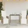 S to udobno bistro garnituro lahko z družino in prijatelji uživate v kavi ali klepetu na vrtu, dvorišču ali balkonu. Vzdržljiv material: PE ratan, znan tudi kot poli ratan, je močan sintetični material, ki zahteva malo vzdrževanja in je videti kot naravni ratan. Je lahek, enostaven za čiščenje in se zaradi svoje vzdržljivosti in odpornosti na vremenske vplive pogosto uporablja za zunanje pohištvo.Nastavljivo naslonjalo za hrbet in noge: Ta vrtni sedež ima ročaj. Naslonjalo za hrbet in naslonjalo za noge lahko s potegom ročaja nastavite v poljuben položaj in ju hitro vrnete v prvotni položaj.Udobno sedenje: To zunanje pohištvo z debelo oblazinjenimi blazinami zagotavlja udobno sedenje.Prevleko je mogoče odstraniti in oprati: Te sedežne blazine imajo odstranljive prevleke za lažje pranje in vzdrževanje. Hrbtne blazine imajo na zadnji strani zavihek za enostavno pritrditev na naslonjala.Steklena mizna plošča: Površina zunanje mize je izdelana iz močnega in trpežnega kaljenega stekla, kar omogoča enostavno čiščenje z vlažno krpo in vašemu zunanjemu prostoru doda pridih elegance. Dobro je vedeti:Če želite, da vaše zunanje pohištvo ostane lepo, vam priporočamo, da ga zaščitite z vodoodporno prevleko.UV-odpornoPotrebno sestavljanje: DaNastavljiv vrtni stol z oporo za noge:Barva: BežMaterial: PE ratan, jeklen okvir s prašnim premazomDimenzije v sedečem položaju: 54,5 x 58,5 x 92 cm (Š x G x V)Dimenzije v ležečem položaju: 54,5 x 111,5 x 83 cm (Š x G x V)Velikost sedeža: 47 x 48 cm (Š x G)Višina sedeža, merjena od tal: 43,5 cmVišina naslonjala za roke od tal: 65 cmMaksimalna nosilnost (na sedež): 110 kgMiza:Barva: BežMaterial: PE ratan, jeklo s prašnim premazom, kaljeno stekloDimenzije: 90 x 90 x 75 cm (D x Š x V)Blazina:Barva: Kremno belaMaterial prevleke: Tkanina (100 % poliester)Polnilo sedežne blazine: PenaPolnilo hrbtne blazine: bombažna vlaknaDimenzije sedežne blazine: 45/49 x 93 x 3 cm (Š x G x D)Dimenzije hrbtne blazine: 70 x 48 x 10 cm (D x Š x D) Paket vsebuje:2 x Nastavljiv vrtni stol z oporo za noge2 x Sedežna blazina s snemljivo pralno prevleko2 x Blazina za hrbet1 x Vrtna miza 3277209