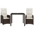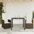 S to udobno bistro garnituro lahko z družino in prijatelji uživate v kavi ali klepetu na vrtu, dvorišču ali balkonu. Vzdržljiv material: PE ratan, znan tudi kot poli ratan, je močan sintetični material, ki zahteva malo vzdrževanja in je videti kot naravni ratan. Je lahek, enostaven za čiščenje in se zaradi svoje vzdržljivosti in odpornosti na vremenske vplive pogosto uporablja za zunanje pohištvo.Nastavljivo naslonjalo: Ta vrtni sedež ima ročaj. S potegom ročaja lahko naslonjalo nastavite v poljuben položaj in ga hitro vrnete v prvotni položaj.Udobno sedenje: To zunanje pohištvo z debelo oblazinjenimi blazinami zagotavlja udobno sedenje.Prevleko je mogoče odstraniti in oprati: Te sedežne blazine imajo odstranljive prevleke za lažje pranje in vzdrževanje. Hrbtne blazine imajo na zadnji strani zavihek za enostavno pritrditev na naslonjala.Steklena mizna plošča: Površina zunanje mize je izdelana iz močnega in trpežnega kaljenega stekla, kar omogoča enostavno čiščenje z vlažno krpo in vašemu zunanjemu prostoru doda pridih elegance. Dobro je vedeti:Če želite, da vaše zunanje pohištvo ostane lepo, vam priporočamo, da ga zaščitite z vodoodporno prevleko.UV-odpornoPotrebno sestavljanje: DaVrtni naslanjač:Barva: RjavaMaterial: PE ratan, jeklen okvir s prašnim premazomDimenzije v sedečem položaju: 54,5 x 58,5 x 92 cm (Š x G x V)Dimenzije v ležečem položaju: 54,5 x 81,5 x 83 cm (Š x G x V)Velikost sedeža: 47 x 48 cm (Š x G)Višina sedeža, merjena od tal: 43,5 cmVišina naslonjala za roke od tal: 65 cmMaksimalna nosilnost (na sedež): 110 kgMiza:Barva: RjavaMaterial: PE ratan, jeklo s prašnim premazom, kaljeno stekloDimenzije: 90 x 90 x 75 cm (D x Š x V)Blazina:Barva: Kremno belaMaterial prevleke: Tkanina (100 % poliester)Polnilo sedežne blazine: PenaPolnilo hrbtne blazine: bombažna vlaknaDimenzije sedežne blazine: 45/49 x 50 x 3 cm (Š x G x D)Dimenzije hrbtne blazine: 70 x 48 x 10 cm (D x Š x D) Paket vsebuje:2 x Vrtni stol s funkcijo nagiba2 x Sedežna blazina s snemljivo pralno prevleko2 x Blazina za hrbet1 x Vrtna miza 3277063