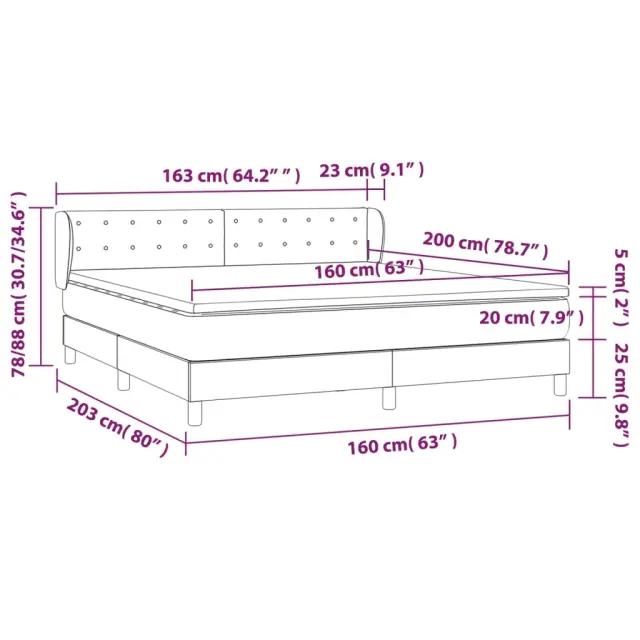 Uporabite to box spring posteljo za uživanje v mirnem spancu! Ponuja maksimalno sprostitev in prijeten spanec. Trpežno blago: Blago zagotavlja preprost in čist videz, poleg tega pa je zračno in trpežno.Praktično vzglavje: Vzglavje postelje je nastavljivo po višini po vaših željah. To vzglavje za posteljo vam zagotavlja odlično oporo za hrbet, ko sedite na postelji in berete ali gledate filme.Ležišče z žepkastimi vzmetmi: Vgrajena individualna žepkasta vzmet je znana po zelo visoki kakovosti, hkrati pa zagotavlja visoko stopnjo vzdržljivosti in prilagodljivosti. Lahko učinkovito absorbira hrup in udarce, ki jih povzročata metanje in obračanje.Srednje trda opora: Posteljna vzmetnica odlično zagotavlja dodatno stabilnost in ravno pravšnjo stopnjo čvrstosti, ne da bi pri tem žrtvovala udobje. Zato je idealna za tiste, ki spijo na hrbtu ali trebuhu.Koži prijazen nadvložek: Zaščita za ležišče ima trpežno in koži prijazno tkanino, zaradi česar je mehka in udobna. Opomba:Zaradi higienskih razlogov vzmetnice ni mogoče vrniti po odstranitvi ali odprtju embalaže.Vsakemu izdelku je priložen priročnik za enostavno sestavljanje.Postelja:Barva: KremMaterial: Blago (100 % poliester), trden macesnov les, vezan les, inženirski lesDimenzije: 203 x 163 x 78/88 cm (D x Š x V)Vzmetnica za posteljo:Barva: Bela in kremnaMaterial: Blago (100 % poliester)Material polnila: Žepkaste vzmeti, penaDimenzije: 160 x 200 x 20 cm (Š x D x V)Nadvložek:Barva: BelaMaterial nadvložka: Blago (100 % poliester)Material polnila: PenaDimenzije: 160 x 200 x 5 cm (Š x D x V)Paket vsebuje:1 x Posteljni okvir1 x Vzglavje z ušesi1 x Vzmetnica1 x Nadvložek 3127138