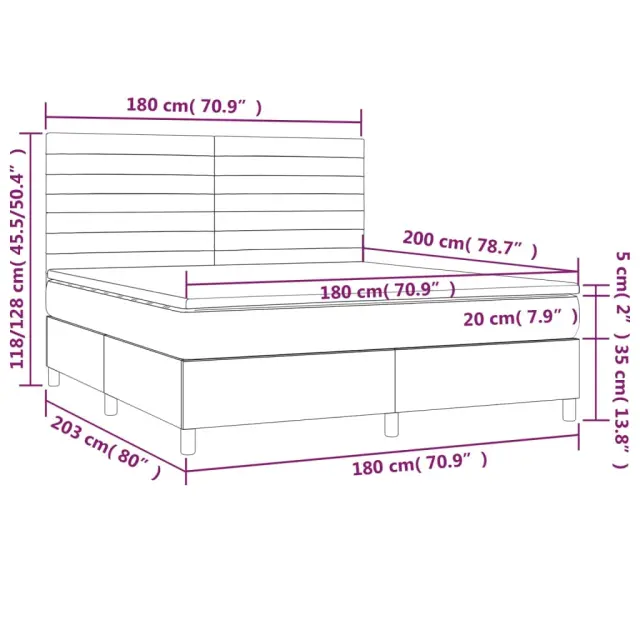 Uporabite to box spring posteljo z vzmetnico in LED osvetlitvijo in uživajte v mirnem spancu! To bo osrednja točka vaše spalnice. Trpežno blago: Blago zagotavlja preprost in čist videz, poleg tega pa je zračno in trpežno.Praktično vzglavje: Vzglavje postelje je nastavljivo po višini po vaših željah. To vzglavje za posteljo vam zagotavlja odlično oporo za hrbet, ko sedite na postelji in berete ali gledate filme.Barvit LED trak: Vnesite igrivost v temo z barvitimi LED lučkami!Ležišče z žepkastimi vzmetmi: Vgrajena individualna žepkasta vzmet je znana po zelo visoki kakovosti, hkrati pa zagotavlja visoko stopnjo vzdržljivosti in prilagodljivosti. Lahko učinkovito absorbira hrup in udarce, ki jih povzročata metanje in obračanje.Koži prijazen nadvložek: Zaščita za ležišče ima trpežno in koži prijazno tkanino, zaradi česar je mehka in udobna. Opomba:Zaradi higienskih razlogov vzmetnice ni mogoče vrniti po odstranitvi ali odprtju embalaže.Režete lahko samo del s simbolom škarij in samo del z USB bo deloval kot prej.Vsakemu izdelku je priložen priročnik za enostavno sestavljanje.Izdelek ima priključek USB, vendar certificiran 5V vir napajanja USB ni priložen.Postelja:Barva: ModraMaterial: Blago (100 % poliester), vezan les, inženirski les, trden macesnov lesCelotne dimenzije: 203 x 180 x 118/128 cm (D x Š x V)Vzmetnica za posteljo:Barva: Bela in modraMaterial: Blago (100 % poliester)Material polnila: Žepkaste vzmeti, penaDimenzije: 180 x 200 x 20 cm (Š x D x V)Nadvložek:Barva: BelaMaterial nadvložka: Blago (100 % poliester)Material polnila: PenaDimenzije: 180 x 200 x 5 cm (Š x D x V)LED trak:Dolžina (vsak): 55 cmNapetost: DC 5 VDolžina kabla USB : 150 cmDolžina električnega kabla: 30 cmIP ocena: IP65S simbolom za rezanje s škarjamiPaket vsebuje:1 x Posteljni okvir1 x Vzglavje1 x Vzmetnica1 x Nadvložek2 x LED trak 3135539