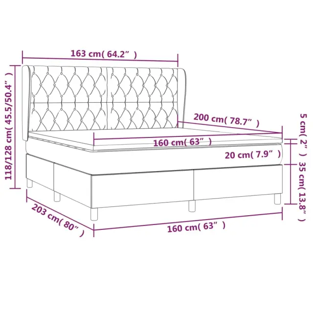 Uporabite to box spring posteljo za uživanje v mirnem spancu! Ponuja maksimalno sprostitev in prijeten spanec. Trpežno blago: Blago zagotavlja preprost in čist videz, poleg tega pa je zračno in trpežno.Praktično vzglavje: Vzglavje postelje je nastavljivo po višini po vaših željah. To vzglavje za posteljo vam zagotavlja odlično oporo za hrbet, ko sedite na postelji in berete ali gledate filme.Ležišče z žepkastimi vzmetmi: Vgrajena individualna žepkasta vzmet je znana po zelo visoki kakovosti, hkrati pa zagotavlja visoko stopnjo vzdržljivosti in prilagodljivosti. Lahko učinkovito absorbira hrup in udarce, ki jih povzročata metanje in obračanje.Srednje trda opora: Posteljna vzmetnica odlično zagotavlja dodatno stabilnost in ravno pravšnjo stopnjo čvrstosti, ne da bi pri tem žrtvovala udobje. Zato je idealna za tiste, ki spijo na hrbtu ali trebuhu.Koži prijazen nadvložek: Zaščita za ležišče ima trpežno in koži prijazno tkanino, zaradi česar je mehka in udobna. Opomba:Zaradi higienskih razlogov vzmetnice ni mogoče vrniti po odstranitvi ali odprtju embalaže.Vsakemu izdelku je priložen priročnik za enostavno sestavljanje.Postelja:Barva: KremMaterial: Blago (100 % poliester), trden macesnov les, vezan les, inženirski lesDimenzije: 203 x 163 x 118/128 cm (D x Š x V)Vzmetnica za posteljo:Barva: Bela in kremnaMaterial: Blago (100 % poliester)Material polnila: Žepkaste vzmeti, penaDimenzije: 160 x 200 x 20 cm (Š x D x V)Nadvložek:Barva: BelaMaterial nadvložka: Blago (100 % poliester)Material polnila: PenaDimenzije: 160 x 200 x 5 cm (Š x D x V)Paket vsebuje:1 x Posteljni okvir1 x Vzglavje z ušesi1 x Vzmetnica1 x Nadvložek 3128218