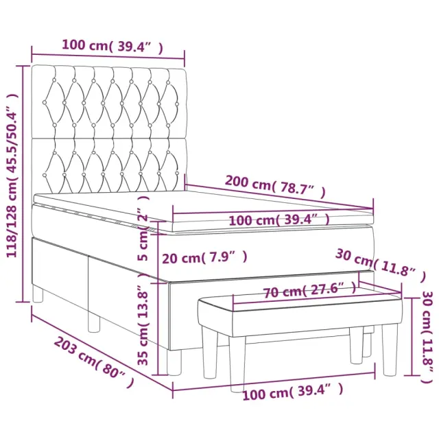 Uporabite to box spring posteljo za uživanje v mirnem spancu! Ponuja maksimalno sprostitev in prijeten spanec. Trpežno blago: Blago zagotavlja preprost in čist videz, poleg tega pa je zračno in trpežno.Praktično vzglavje: Vzglavje postelje je nastavljivo po višini po vaših željah. To vzglavje za posteljo vam zagotavlja odlično oporo za hrbet, ko sedite na postelji in berete ali gledate filme.Ležišče z žepkastimi vzmetmi: Vgrajena individualna žepkasta vzmet je znana po zelo visoki kakovosti, hkrati pa zagotavlja visoko stopnjo vzdržljivosti in prilagodljivosti. Lahko učinkovito absorbira hrup in udarce, ki jih povzročata metanje in obračanje.Srednje trda opora: Posteljna vzmetnica odlično zagotavlja dodatno stabilnost in ravno pravšnjo stopnjo čvrstosti, ne da bi pri tem žrtvovala udobje. Zato je idealna za tiste, ki spijo na hrbtu ali trebuhu.Koži prijazen nadvložek: Zaščita za ležišče ima trpežno in koži prijazno tkanino, zaradi česar je mehka in udobna.Večnamenska klop: Ta klop lahko služi kot dodaten sedež v vašem domu. Lahko se uporablja tudi kot zaključek posteljne klopi. Opomba:Zaradi higienskih razlogov vzmetnice ni mogoče vrniti po odstranitvi ali odprtju embalaže.Vsakemu izdelku je priložen priročnik za enostavno sestavljanje.Postelja:Barva: TaupeMaterial: Blago (100 % poliester), vezan les, konstruiran lesDimenzije: 203 x 100 x 118/128 cm (D x Š x V)Vzmetnica za posteljo:Barva: Taupe in belaMaterial: Blago (100 % poliester)Material polnila: Žepkaste vzmeti, penaDimenzije: 100 x 200 x 20 cm (Š x D x V)Nadvložek:Barva: BelaMaterial: Blago (100 % poliester)Material polnila: PenaDimenzije: 100 x 200 x 5 cm (Š x D x V)Klop:Barva: TaupeMaterial: Blago (100 % poliester), vezan les, konstruiran lesDimenzije: 70 x 30 x 30 cm (Š x G x V)Paket vsebuje:1 x Posteljni okvir1 x Vzglavje1 x Vzmetnica1 x Nadvložek1 x Klop 3137377