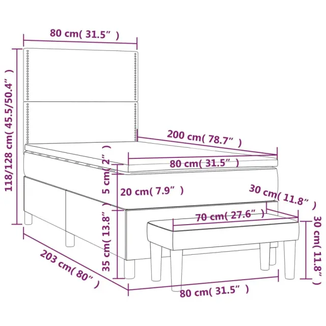 Uporabite to box spring posteljo za uživanje v mirnem spancu! Ponuja maksimalno sprostitev in prijeten spanec. Trpežno blago: Blago zagotavlja preprost in čist videz, poleg tega pa je zračno in trpežno.Praktično vzglavje: Vzglavje postelje je nastavljivo po višini po vaših željah. To vzglavje za posteljo vam zagotavlja odlično oporo za hrbet, ko sedite na postelji in berete ali gledate filme.Ležišče z žepkastimi vzmetmi: Vgrajena individualna žepkasta vzmet je znana po zelo visoki kakovosti, hkrati pa zagotavlja visoko stopnjo vzdržljivosti in prilagodljivosti. Lahko učinkovito absorbira hrup in udarce, ki jih povzročata metanje in obračanje.Srednje trda opora: Posteljna vzmetnica odlično zagotavlja dodatno stabilnost in ravno pravšnjo stopnjo čvrstosti, ne da bi pri tem žrtvovala udobje. Zato je idealna za tiste, ki spijo na hrbtu ali trebuhu.Koži prijazen nadvložek: Zaščita za ležišče ima trpežno in koži prijazno tkanino, zaradi česar je mehka in udobna.Večnamenska klop: Ta klop lahko služi kot dodaten sedež v vašem domu. Lahko se uporablja tudi kot zaključek posteljne klopi. Opomba:Zaradi higienskih razlogov vzmetnice ni mogoče vrniti po odstranitvi ali odprtju embalaže.Vsakemu izdelku je priložen priročnik za enostavno sestavljanje.Postelja:Barva: ČrnaMaterial: Blago (100 % poliester), vezan les, konstruiran lesDimenzije: 203 x 80 x 118/128 cm (D x Š x V)Vzmetnica za posteljo:Barva: Črna in belaMaterial: Blago (100 % poliester)Material polnila: Žepkaste vzmeti, penaDimenzije: 80 x 200 x 20 cm (Š x D x V)Nadvložek:Barva: BelaMaterial: Blago (100 % poliester)Material polnila: PenaDimenzije: 80 x 200 x 5 cm (Š x D x V)Klop:Barva: ČrnaMaterial: Blago (100 % poliester), vezan les, konstruiran lesDimenzije: 70 x 30 x 30 cm (Š x G x V)Paket vsebuje:1 x Posteljni okvir1 x Vzglavje1 x Vzmetnica1 x Nadvložek1 x Klop 3137031