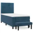 Uporabite to box spring posteljo za uživanje v mirnem spancu! Ponuja maksimalno sprostitev in prijeten spanec. Mehak žamet: Žamet je mehka in razkošna tkanina, ki jo prepoznamo po gostem kupu enakomerno rezanih gladkih vlaken. Žametna tkanina ima značilen mehak občutek, zaradi česar je prijetna na dotik.Praktično vzglavje: Vzglavje postelje je nastavljivo po višini po vaših željah. To vzglavje za posteljo vam zagotavlja odlično oporo za hrbet, ko sedite na postelji in berete ali gledate filme.Ležišče z žepkastimi vzmetmi: Vgrajena individualna žepkasta vzmet je znana po zelo visoki kakovosti, hkrati pa zagotavlja visoko stopnjo vzdržljivosti in prilagodljivosti. Lahko učinkovito absorbira hrup in udarce, ki jih povzročata metanje in obračanje.Srednje trda opora: Posteljna vzmetnica odlično zagotavlja dodatno stabilnost in ravno pravšnjo stopnjo čvrstosti, ne da bi pri tem žrtvovala udobje. Zato je idealna za tiste, ki spijo na hrbtu ali trebuhu.Koži prijazen nadvložek: Zaščita za ležišče ima trpežno in koži prijazno tkanino, zaradi česar je mehka in udobna.Večnamenska klop: Ta klop lahko služi kot dodaten sedež v vašem domu. Lahko se uporablja tudi kot zaključek posteljne klopi. Opomba:Zaradi higienskih razlogov vzmetnice ni mogoče vrniti po odstranitvi ali odprtju embalaže.Vsakemu izdelku je priložen priročnik za enostavno sestavljanje.Postelja:Barva: Temno modraMaterial: Žamet (100 % poliester), vezan les, konstruiran lesDimenzije: 203 x 90 x 118/128 cm (D x Š x V)Vzmetnica za posteljo:Barva: Temno modra in belaMaterial: Žamet (100 % poliester)Material polnila: Žepkaste vzmeti, penaDimenzije: 90 x 200 x 20 cm (Š x D x V)Nadvložek:Barva: BelaMaterial: Blago (100 % poliester)Material polnila: PenaDimenzije: 90 x 200 x 5 cm (Š x D x V)Klop:Barva: Temno modraMaterial: Žamet (100 % poliester), vezan les, konstruiran lesDimenzije: 70 x 30 x 30 cm (Š x G x V)Paket vsebuje:1 x Posteljni okvir1 x Vzglavje1 x Vzmetnica1 x Nadvložek1 x Klop 3137765