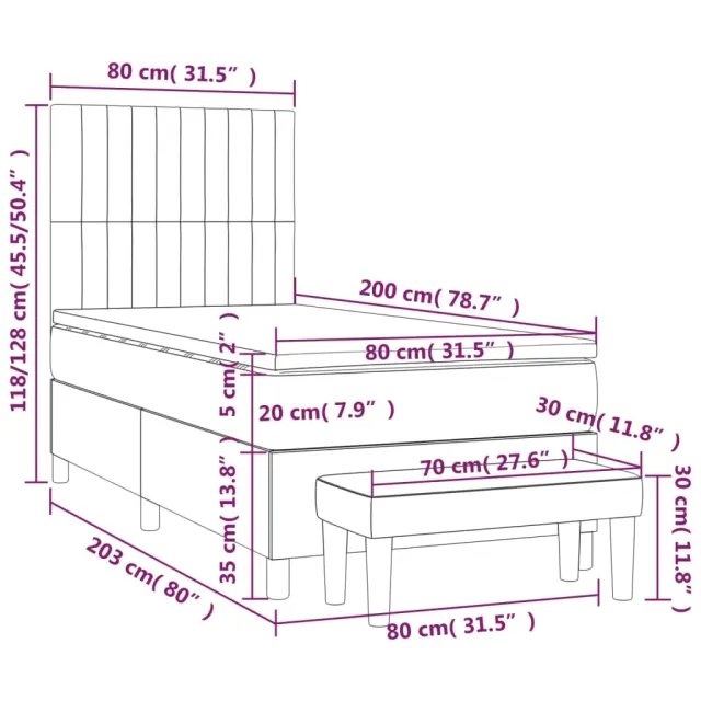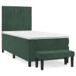 Uporabite to box spring posteljo za uživanje v mirnem spancu! Ponuja maksimalno sprostitev in prijeten spanec. Mehak žamet: Žamet je mehka in razkošna tkanina, ki jo prepoznamo po gostem kupu enakomerno rezanih gladkih vlaken. Žametna tkanina ima značilen mehak občutek, zaradi česar je prijetna na dotik.Praktično vzglavje: Vzglavje postelje je nastavljivo po višini po vaših željah. To vzglavje za posteljo vam zagotavlja odlično oporo za hrbet, ko sedite na postelji in berete ali gledate filme.Ležišče z žepkastimi vzmetmi: Vgrajena individualna žepkasta vzmet je znana po zelo visoki kakovosti, hkrati pa zagotavlja visoko stopnjo vzdržljivosti in prilagodljivosti. Lahko učinkovito absorbira hrup in udarce, ki jih povzročata metanje in obračanje.Srednje trda opora: Posteljna vzmetnica odlično zagotavlja dodatno stabilnost in ravno pravšnjo stopnjo čvrstosti, ne da bi pri tem žrtvovala udobje. Zato je idealna za tiste, ki spijo na hrbtu ali trebuhu.Koži prijazen nadvložek: Zaščita za ležišče ima trpežno in koži prijazno tkanino, zaradi česar je mehka in udobna.Večnamenska klop: Ta klop lahko služi kot dodaten sedež v vašem domu. Lahko se uporablja tudi kot zaključek posteljne klopi. Opomba:Zaradi higienskih razlogov vzmetnice ni mogoče vrniti po odstranitvi ali odprtju embalaže.Vsakemu izdelku je priložen priročnik za enostavno sestavljanje.Postelja:Barva: Temno zelenaMaterial: Žamet (100 % poliester), vezan les, konstruiran lesDimenzije: 203 x 80 x 118/128 cm (D x Š x V)Vzmetnica za posteljo:Barva: Temno zelena in belaMaterial: Žamet (100 % poliester)Material polnila: Žepkaste vzmeti, penaDimenzije: 80 x 200 x 20 cm (Š x D x V)Nadvložek:Barva: BelaMaterial: Blago (100 % poliester)Material polnila: PenaDimenzije: 80 x 200 x 5 cm (Š x D x V)Klop:Barva: Temno zelenaMaterial: Žamet (100 % poliester), vezan les, konstruiran lesDimenzije: 70 x 30 x 30 cm (Š x G x V)Paket vsebuje:1 x Posteljni okvir1 x Vzglavje1 x Vzmetnica1 x Nadvložek1 x Klop 3137932