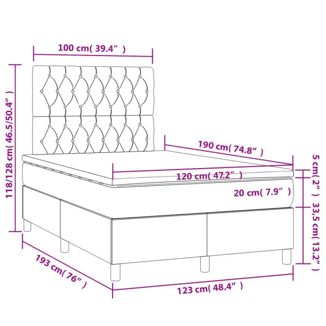 Uporabite to box spring posteljo za uživanje v mirnem spancu! Ponuja maksimalno sprostitev in prijeten spanec. Trpežno blago: Blago zagotavlja preprost in čist videz, poleg tega pa je zračno in trpežno.Praktično vzglavje: Vzglavje postelje je nastavljivo po višini po vaših željah. To vzglavje za posteljo vam zagotavlja odlično oporo za hrbet, ko sedite na postelji in berete ali gledate filme.Ležišče z žepkastimi vzmetmi: Vgrajena individualna žepkasta vzmet je znana po zelo visoki kakovosti, hkrati pa zagotavlja visoko stopnjo vzdržljivosti in prilagodljivosti. Lahko učinkovito absorbira hrup in udarce, ki jih povzročata metanje in obračanje.Srednje trda opora: Posteljna vzmetnica odlično zagotavlja dodatno stabilnost in ravno pravšnjo stopnjo čvrstosti, ne da bi pri tem žrtvovala udobje. Zato je idealna za tiste, ki spijo na hrbtu ali trebuhu.Koži prijazen nadvložek: Zaščita za ležišče ima trpežno in koži prijazno tkanino, zaradi česar je mehka in udobna. Dobro je vedeti:Zaradi higienskih razlogov vzmetnice ni mogoče vrniti po odstranitvi ali odprtju embalaže.Postelja:Barva: ČrnaMaterial: Tkanina (100 % poliester), vezan les, inženirski les, trdna borovinaDimenzije: 193 x 123 x 118/128 cm (D x Š x V)Vzmetnica za posteljo:Barva: Črna in belaMaterial: Blago (100 % poliester)Material polnila: Žepkaste vzmeti, penaDimenzije: 120 x 190 x 20 cm (Š x D x V)Nadvložek:Barva: BelaMaterial nadvložka: Blago (100 % poliester)Material polnila: PenaDimenzije: 120 x 190 x 5 cm (Š x D x V)Potrebno sestavljanje: DaPaket vsebuje:1 x Posteljni okvir2 x Vzglavje1 x Vzmetnica1 x Nadvložek 3269904
