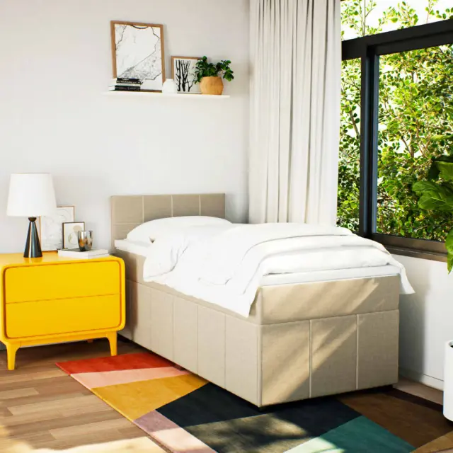 Uporabite to posteljo za uživanje v mirnem spancu! Ponuja maksimalno sprostitev in prijeten spanec. Mehak in trpežen material: Tkanina iz poliestra združuje mehkobo, zračnost in trpežnost ter vam zagotavlja popolno udobje in prijetnost.Ležišče z žepkastimi vzmetmi: Ta vzmetnica z žepkastimi vzmetmi ima posamezne žepkaste vzmeti, ki delujejo neodvisno in zagotavljajo prilagojeno podporo, saj se odzivajo le na pritisk na posameznem območju. Takšna zasnova preprečuje, da bi se ležišče "zvijalo skupaj", in zmanjšuje prenos gibanja v primerjavi s tradicionalnimi ležišči z odprtimi vzmetmi. Vsaka žepkasta vzmet podpira telo posebej.Nastavljiva višina vzglavja: Višina vzglavja je nastavljiva po vaših željah.Udobna vzmetnica: Ta nadvložek za vzmetnico z mehko in zračno površino poveča podporo in udobje ter hkrati podaljša življenjsko dobo vaše vzmetnice. Odstranljiva prevleka omogoča enostavno pranje, zato je vzdrževanje enostavno.Letvice za optimalno podporo: Okvir postelje je opremljen z letvicami, ki zagotavljajo osnovno podporo in zračnost vašega ležišča. Dobro je vedeti:Zaradi higienskih razlogov vzmetnice ni mogoče vrniti po odstranitvi ali odprtju embalaže.Posteljni okvir z vzglavjem:Barva: KremMaterial: Blago (100 % poliester), vezan les, konstruiran lesDimenzije: 200 x 80 x 100,5 cm (D x Š x V)Utrjene plastične nogicePotrebno sestavljanje: DaVzmetnica:Barva: Bela in kremnaMaterial: Blago (100 % poliester)Material polnila: Žepkaste vzmeti, penaTrdnost: SrednjaDimenzije: 80 x 200 x 20 cm (Š x D x V)Nadvzmetnica:Barva: BelaMaterial: Blago (100 % poliester)Material polnila: PenaDimenzije: 80 x 200 x 5 cm (Š x D x V)Odstranljiva in pralna prevlekaPaket vsebuje:1 x Posteljni okvir1 x Vzglavje1 x Vzmetnica1 x Nadvložek 3286900