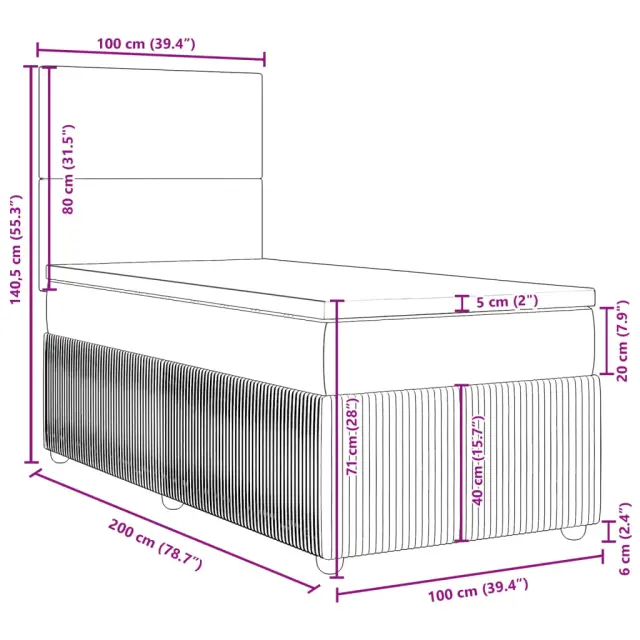 Uporabite to posteljo za uživanje v mirnem spancu! Ponuja maksimalno sprostitev in prijeten spanec. Mehak in udoben material: Vlažna tkanina iz žameta ima mehko in gladko površino, ki zagotavlja prijeten občutek ter vam zagotavlja toploto in popolno udobje.Ležišče z žepkastimi vzmetmi: Ta vzmetnica z žepkastimi vzmetmi ima posamezne žepkaste vzmeti, ki delujejo neodvisno in zagotavljajo prilagojeno podporo, saj se odzivajo le na pritisk na posameznem območju. Takšna zasnova preprečuje, da bi se ležišče "zvijalo skupaj", in zmanjšuje prenos gibanja v primerjavi s tradicionalnimi ležišči z odprtimi vzmetmi. Vsaka žepkasta vzmet podpira telo posebej.Nastavljiva višina vzglavja: Višina vzglavja je nastavljiva po vaših željah.Udobna vzmetnica: Ta nadvložek za vzmetnico z mehko in zračno površino poveča podporo in udobje ter hkrati podaljša življenjsko dobo vaše vzmetnice. Odstranljiva prevleka omogoča enostavno pranje, zato je vzdrževanje enostavno.Letvice za optimalno podporo: Okvir postelje je opremljen z letvicami, ki zagotavljajo osnovno podporo in zračnost vašega ležišča. Dobro je vedeti:Zaradi higienskih razlogov vzmetnice ni mogoče vrniti po odstranitvi ali odprtju embalaže.Posteljni okvir z vzglavjem:Barva: Temno modraMaterial: Žamet (100 % poliester), vezan les, konstruiran lesDimenzije: 200 x 100 x 140,5/150,5 cm (D x Š x V)Utrjene plastične nogicePotrebno sestavljanje: DaVzmetnica:Barva: Bela in temno modraMaterial: Žamet (100 % poliester)Material polnila: Žepkaste vzmeti, penaTrdnost: SrednjaDimenzije: 100 x 200 x 20 cm (Š x D x V)Nadvzmetnica:Barva: BelaMaterial: Blago (100 % poliester)Material polnila: PenaDimenzije: 100 x 200 x 5 cm (Š x D x V)Odstranljiva in pralna prevlekaPaket vsebuje:1 x Posteljni okvir1 x Vzglavje1 x Vzmetnica1 x Nadvložek 3292260