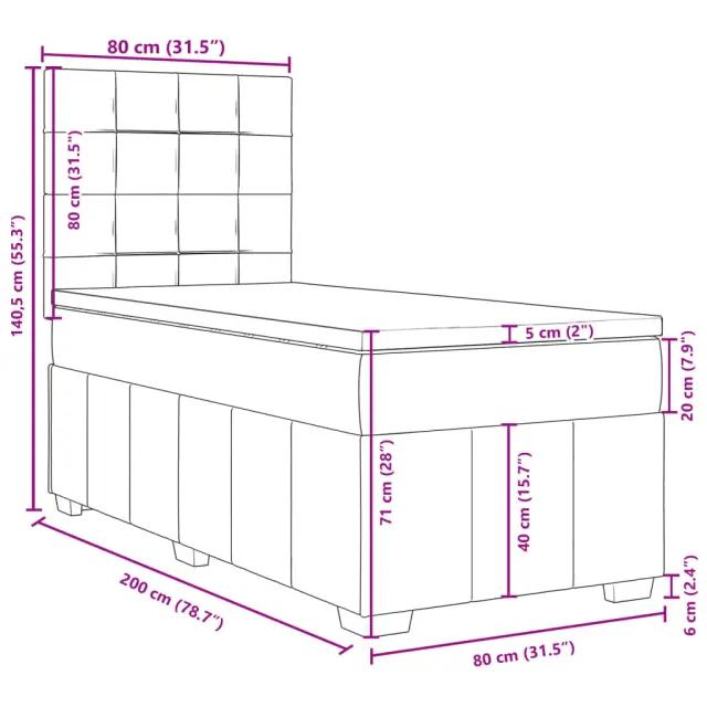 Uporabite to posteljo za uživanje v mirnem spancu! Ponuja maksimalno sprostitev in prijeten spanec. Mehak in trpežen material: Tkanina iz poliestra združuje mehkobo, zračnost in trpežnost ter vam zagotavlja popolno udobje in prijetnost.Ležišče z žepkastimi vzmetmi: Ta vzmetnica z žepkastimi vzmetmi ima posamezne žepkaste vzmeti, ki delujejo neodvisno in zagotavljajo prilagojeno podporo, saj se odzivajo le na pritisk na posameznem območju. Takšna zasnova preprečuje, da bi se ležišče "zvijalo skupaj", in zmanjšuje prenos gibanja v primerjavi s tradicionalnimi ležišči z odprtimi vzmetmi. Vsaka žepkasta vzmet podpira telo posebej.Nastavljiva višina vzglavja: Višina vzglavja je nastavljiva po vaših željah.Udobna vzmetnica: Ta nadvložek za vzmetnico z mehko in zračno površino poveča podporo in udobje ter hkrati podaljša življenjsko dobo vaše vzmetnice. Odstranljiva prevleka omogoča enostavno pranje, zato je vzdrževanje enostavno.Letvice za optimalno podporo: Okvir postelje je opremljen z letvicami, ki zagotavljajo osnovno podporo in zračnost vašega ležišča. Dobro je vedeti:Zaradi higienskih razlogov vzmetnice ni mogoče vrniti po odstranitvi ali odprtju embalaže.Posteljni okvir z vzglavjem:Barva: TaupeMaterial: Blago (100 % poliester), vezan les, konstruiran lesDimenzije: 200 x 80 x 140,5/150,5 cm (D x Š x V)Utrjene plastične nogicePotrebno sestavljanje: DaVzmetnica:Barva: Bela in taupeMaterial: Blago (100 % poliester)Material polnila: Žepkaste vzmeti, penaTrdnost: SrednjaDimenzije: 80 x 200 x 20 cm (Š x D x V)Nadvzmetnica:Barva: BelaMaterial: Blago (100 % poliester)Material polnila: PenaDimenzije: 80 x 200 x 5 cm (Š x D x V)Odstranljiva in pralna prevlekaPaket vsebuje:1 x Posteljni okvir1 x Vzglavje1 x Vzmetnica1 x Nadvložek 3291499