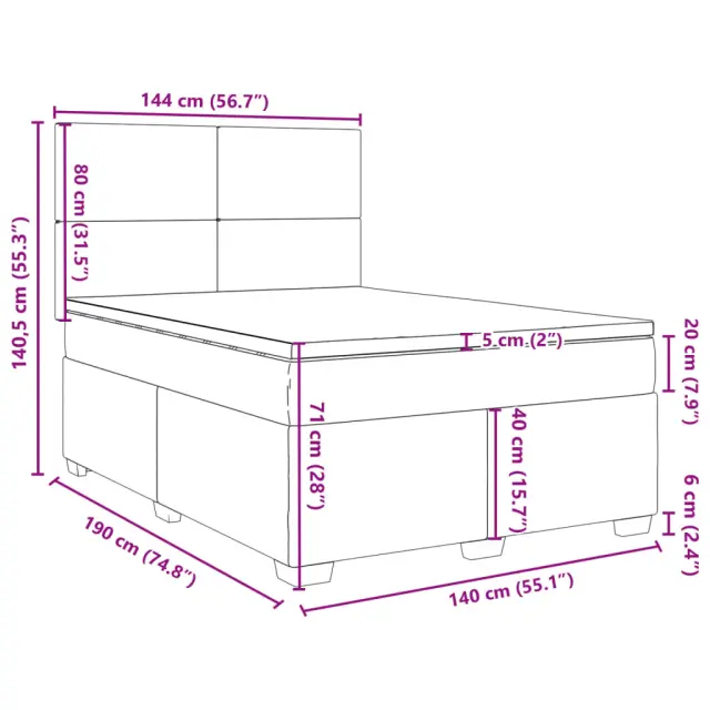 Uporabite to posteljo za uživanje v mirnem spancu! Ponuja maksimalno sprostitev in prijeten spanec. Mehak in trpežen material: Tkanina iz poliestra združuje mehkobo, zračnost in trpežnost ter vam zagotavlja popolno udobje in prijetnost.Ležišče z žepkastimi vzmetmi: Ta vzmetnica z žepkastimi vzmetmi ima posamezne žepkaste vzmeti, ki delujejo neodvisno in zagotavljajo prilagojeno podporo, saj se odzivajo le na pritisk na posameznem območju. Takšna zasnova preprečuje, da bi se ležišče "zvijalo skupaj", in zmanjšuje prenos gibanja v primerjavi s tradicionalnimi ležišči z odprtimi vzmetmi. Vsaka žepkasta vzmet podpira telo posebej.Nastavljiva višina vzglavja: Višina vzglavja je nastavljiva po vaših željah.Udobna vzmetnica: Ta nadvložek za vzmetnico z mehko in zračno površino poveča podporo in udobje ter hkrati podaljša življenjsko dobo vaše vzmetnice. Odstranljiva prevleka omogoča enostavno pranje, zato je vzdrževanje enostavno.Letvice za optimalno podporo: Okvir postelje je opremljen z letvicami, ki zagotavljajo osnovno podporo in zračnost vašega ležišča. Dobro je vedeti:Zaradi higienskih razlogov vzmetnice ni mogoče vrniti po odstranitvi ali odprtju embalaže.Posteljni okvir z vzglavjem:Barva: ČrnaMaterial: Blago (100 % poliester), vezan les, konstruiran lesDimenzije: 190 x 144 x 140,5/150,5 cm (D x Š x V)Utrjene plastične nogicePodporne noge iz trdnega borovega lesaVzmetnica:Barva: Bela in črnaMaterial prevleke: Tkanina (100 % poliester)Material polnila: Žepkaste vzmeti, penaTrdnost: SrednjaDimenzije: 140 x 190 x 20 cm (Š x D x V)Nadvzmetnica:Barva: BelaMaterial: Blago (100 % poliester)Material polnila: PenaDimenzije: 140 x 190 x 5 cm (Š x D x V)Odstranljiva in pralna prevleka Paket vsebuje:1 x Posteljni okvir1 x Vzglavje1 x Vzmetnica1 x Nadvložek 3290478
