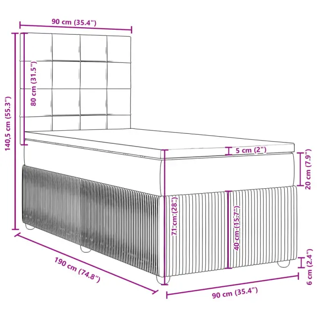Uporabite to posteljo za uživanje v mirnem spancu! Ponuja maksimalno sprostitev in prijeten spanec. Mehak in udoben material: Vlažna tkanina iz žameta ima mehko in gladko površino, ki zagotavlja prijeten občutek ter vam zagotavlja toploto in popolno udobje. Ležišče z žepkastimi vzmetmi: Ta vzmetnica z žepkastimi vzmetmi ima posamezne žepkaste vzmeti, ki delujejo neodvisno in zagotavljajo prilagojeno podporo, saj se odzivajo le na pritisk na posameznem območju. Takšna zasnova preprečuje, da bi se ležišče "zvijalo skupaj", in zmanjšuje prenos gibanja v primerjavi s tradicionalnimi ležišči z odprtimi vzmetmi. Vsaka žepkasta vzmet podpira telo posebej. LED osvetlitev za prijeten ambient: To posteljo odlikuje LED osvetlitev, ki jo je mogoče preprosto nastaviti in tako ustvariti posebno svetlobno predstavo. Prilagodite lahko načine, barve in svetlost ter tako izboljšate vzdušje v notranjem prostoru. Nastavljiva višina vzglavja: Višina vzglavja je nastavljiva po vaših željah. Udobna vzmetnica: Ta nadvložek za vzmetnico z mehko in zračno površino poveča podporo in udobje ter hkrati podaljša življenjsko dobo vaše vzmetnice. Odstranljiva prevleka omogoča enostavno pranje, zato je vzdrževanje enostavno. Dobro je vedeti: Izdelek ima priključek USB, ki zahteva certificiran vir napajanja 5 V USB (ni priložen). Zaradi higienskih razlogov vzmetnice ni mogoče vrniti po odstranitvi ali odprtju embalaže. Režete lahko samo del s simbolom škarij in samo del z USB bo deloval kot prej.Posteljni okvir z vzglavjem:Barva: Svetlo sivaMaterial: Žamet (100 % poliester), vezan les, konstruiran lesDimenzije: 190 x 90 x 140,5/150,5 cm (D x Š x V)Utrjene plastične nogicePotrebno sestavljanje: DaVzmetnica:Barva: Bela in svetlo sivaMaterial: Žamet (100 % poliester)Material polnila: Žepkaste vzmeti, penaTrdnost: SrednjaDimenzije: 90 x 190 x 20 cm (Š x D x V)Nadvzmetnica:Barva: BelaMaterial: Blago (100 % poliester)Material polnila: PenaDimenzije: 90 x 190 x 5 cm (Š x D x V)Odstranljiva in pralna prevlekaLED trak:Dolžina: 55 cmNapetost: DC 5 VDolžina kabla USB : 150 cmDolžina električnega kabla: 30 cmIP ocena: IP65S simbolom za rezanje s škarjamiPaket vsebuje:1 x Posteljni okvir1 x Vzglavje1 x Vzmetnica1 x Nadvložek1 x LED trak 3294514