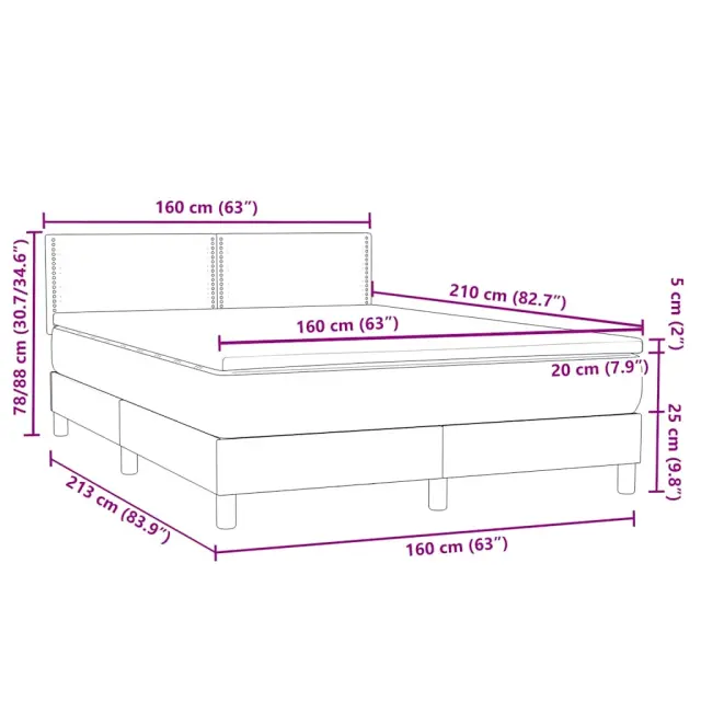 Uporabite to box spring posteljo za uživanje v mirnem spancu! Ponuja maksimalno sprostitev in prijeten spanec. Mehak in udoben material: Vlažna tkanina iz žameta ima mehko in gladko površino, ki zagotavlja prijeten občutek ter vam zagotavlja toploto in popolno udobje.Ležišče z žepkastimi vzmetmi: Ta vzmetnica z žepkastimi vzmetmi ima posamezne žepkaste vzmeti, ki delujejo neodvisno in zagotavljajo prilagojeno podporo, saj se odzivajo le na pritisk na posameznem območju. Takšna zasnova preprečuje, da bi se ležišče "zvijalo skupaj", in zmanjšuje prenos gibanja v primerjavi s tradicionalnimi ležišči z odprtimi vzmetmi. Vsaka žepkasta vzmet podpira telo posebej.Udobna vzmetnica: Ta nadvložek za vzmetnico z mehko in zračno površino poveča podporo in udobje ter hkrati podaljša življenjsko dobo vaše vzmetnice. Odstranljiva prevleka omogoča enostavno pranje, zato je vzdrževanje enostavno.Praktično vzglavje: Vzglavje postelje je nastavljivo po višini po vaših željah. To vzglavje za posteljo vam zagotavlja odlično oporo za hrbet, ko sedite na postelji in berete ali gledate filme.LED osvetlitev za prijeten ambient: To posteljo odlikuje LED osvetlitev, ki jo je mogoče preprosto nastaviti in tako ustvariti posebno svetlobno predstavo. Prilagodite lahko načine, barve in svetlost ter tako izboljšate vzdušje v notranjem prostoru. Dobro je vedeti:Izdelek ima priključek USB, ki zahteva certificiran vir napajanja 5 V USB (ni priložen).Zaradi higienskih razlogov vzmetnice ni mogoče vrniti po odstranitvi ali odprtju embalaže.Režete lahko samo del s simbolom škarij in samo del z USB bo deloval kot prej.Posteljni okvir z vzglavjem:Barva: RozaMaterial: Žamet (100 % poliester), vezan les, konstruiran lesDimenzije: 213 x 160 x 78/88 cm (D x Š x V)Potrebno sestavljanje: DaVzmetnica:Barva: Roza in belaMaterial: Žamet (100 % poliester)Material polnila: Žepkaste vzmeti, penaDimenzije: 160 x 210 x 20 cm (Š x D x V)Nadvzmetnica:Barva: BelaMaterial: Blago (100 % poliester)Material polnila: PenaDimenzije: 160 x 210 x 5 cm (Š x D x V)Odstranljiva in pralna prevlekaLED trak:Dolžina: 55 cmNapetost: DC 5 VDolžina kabla USB : 150 cmDolžina električnega kabla: 30 cmIP ocena: IP65S simbolom za rezanje s škarjamiPaket vsebuje:1 x Posteljni okvir1 x Vzglavje1 x Vzmetnica1 x Nadvložek1 x LED trak 3316796