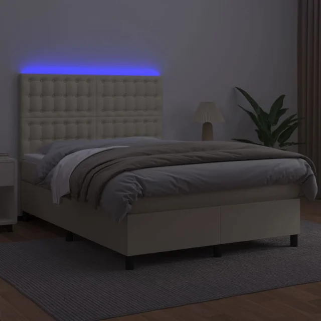 vidaXL Box spring postelja z vzmetnico LED krem 140x190cm umetno usnje