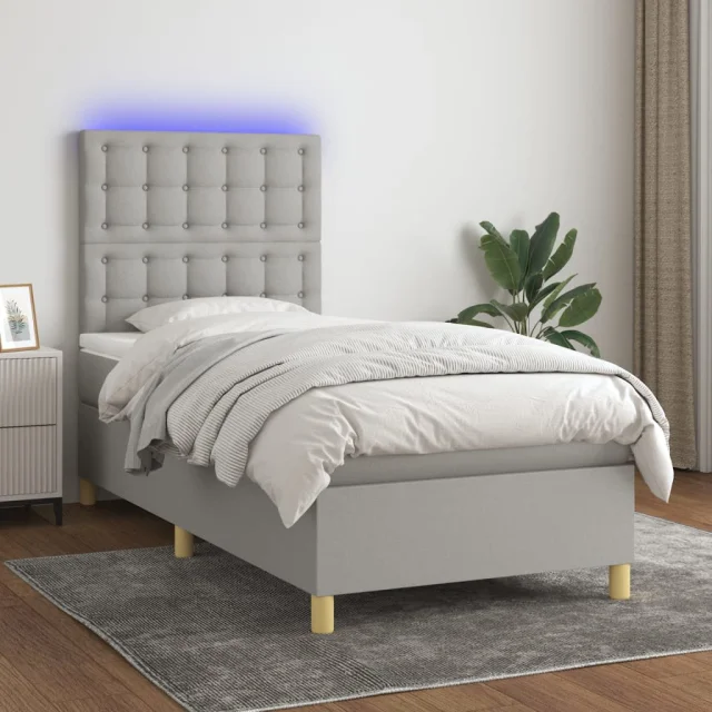 vidaXL Box spring postelja z vzmetnico LED svetlo siva 90x200 cm blago