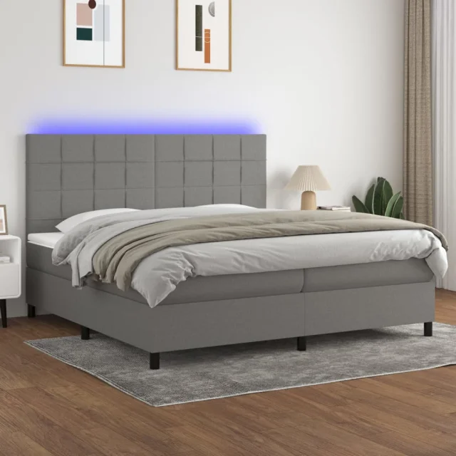 vidaXL Box spring postelja z vzmetnico LED temno siva 200x200 cm blago